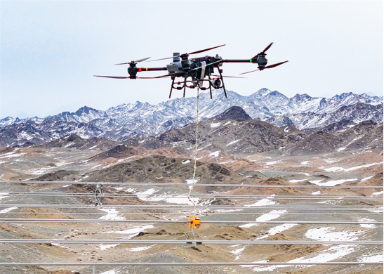 新疆送变电公司员工利用大载重无人机吊装“观冰精灵”设备。张灵军 摄