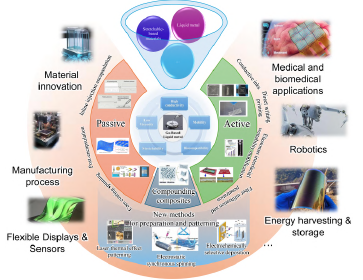 摘要:拉伸电子器件因具有优异的机械性能和电学性能,已成为当下信息电子领域的研究热点。作为拉伸电子器件中的高速电子传输通道,可拉伸导电材料在实现拉伸电子器件功能中起着至关重要的作用。液态金属因兼具本征柔性和优异导电性能,近年来逐渐成为拉伸导电复合材料领域的热点研究对象。液态金属是一种常温液态导电材料,由于其固有的高导电性、流动性和延展性,使其表现出优异的可拉伸性和可调性。基于液态金属的可拉伸导电复合材料制备与图案化技术相继被报道,并成功应用于制备兼具优秀机械和电气性能的可拉伸器件。鉴于液态金属基可拉伸复合材料的一般结构特点,制备的关键是如何解决不同材料之间物性差异所导致的界面处非浸润问题。因此,本文从常见的复合材料种类出发,首先简要介绍了常被采用的液态金属的一般组分与物理性质,以及常用的可拉伸聚合物基质材料。然后分别从“被动”和“主动”两种应对界面非浸润问题的解决方式以及共混分散法、新式改性法等综述了液态金属基导电复合材料中液态金属与弹性材料的复合方法。最后对这一领域的最新研究进展做了简单介绍,并对未来液态金属基复合导电材料的研究方向和所面临的问题做了初步探讨。