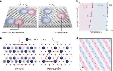 研究团队将一种只有原子级厚度的三硫化磷镍冷却到约零下150℃至零下130℃之间。此时,他们观察到,这种材料首先进入一种被称为“贝列津斯基—科斯特利茨—索利斯”(BKT)相的特殊状态。在这种状态下,材料中每个原子的磁矩不再简单地朝向某一固定方向,而是形成类似旋涡的结构。这些旋涡成对出现,一顺时针、一逆时针,并彼此束缚在一起。