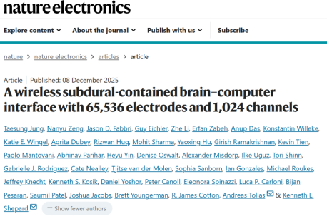 近日,相关论文以《一种具有 65,536 个电极和 1,024 个通道的无线硬膜下脑机接口》(A wireless subdural-contained brain–computer interface with 65,536 electrodes and 1,024 channels)为题发表在 Nature Electronics[1]。哥伦比亚大学 Taesung Jung 博士和曾南宇博士是共同第一作者,肯尼思・谢泼德(Kenneth Shepard)教授担任通讯作者。