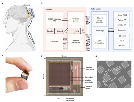 该系统包括一个单芯片植入体、一个可穿戴式转发器以及操作系统所需的定制软件。系统的核心由 CMOS 芯片构成,厚度仅 50 微米,比一根头发丝还薄,并集成了 65,536 个微型电极、信号供电电路、无线收发器、数据转换和模拟电路等。