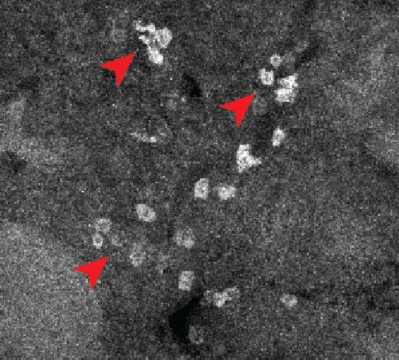 荧光成像显示伊布替尼在脾脏中结合。红色箭头表示伊布替尼阳性细胞。