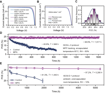 得益于这一技术,研究团队制备的n-i-p钙钛矿太阳能电池实现了高效率与高稳定性的统一。其中,小面积器件光电转化效率达26.6%,1平方厘米器件效率为24.9%,16平方厘米组件效率仍保持23.0%。更突出的是其稳定性:在85℃高温、60%湿度的严苛条件下连续工作1600小时后,效率保持率仍超过98%;在常温环境中存放超过5000小时,性能几乎无衰减。
