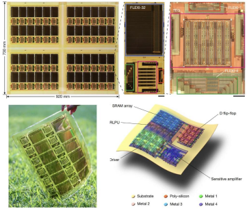 新研发的柔性AI芯片采用CMOS低温多晶硅(LTPS)工艺,可直接在柔性基底上制造,兼具低功耗、低成本和高集成度优势。研究团队通过工艺革新增加金属层数,突破了传统柔性电子难以支持复杂芯片互联的瓶颈;创新采用数字“存内计算”架构,在存储器内部完成数据处理,既消除了数据搬运的时间与能耗开销,又突破了“存储墙”性能限制,表现优于传统模拟方案。