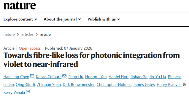 近日,相关论文以《从紫光到近红外波段,通往光纤级损耗的光子集成》(Towards fibre-like loss for photonic integration from violet to near-infrared)为题发表 Nature 上。