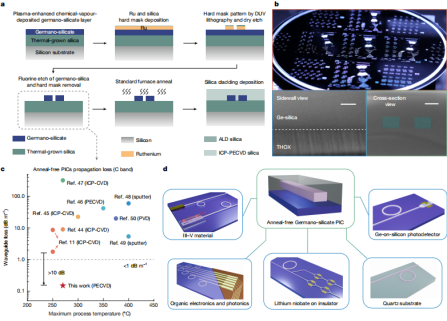 此外,即使在退火前,该光子芯片也能达到<1dB/m 的超低损耗,这代表与热敏感材料(包括三五族半导体激光器、薄膜铌酸锂、有机光电材料)具有良好的多材料异质集成兼容性。
