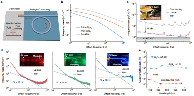 尤为重要的是,研究团队将可见光芯片激光器的线宽压窄到 10Hz 量级,相比之前的记录优化了 2 到 3 个数量级,对于工作在此波段的原子传感器、光学原子钟、中性原子/离子阱量子计算系统至关重要。