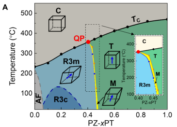 这次,该团队换了一个思路:不再和材料本身的脾气硬碰硬,而是给其创造一个能够完美发挥的工作环境。他们在传统锆钛酸铅压电陶瓷中找到了一个在温度和在成分相图上极为特殊的点——四相点。这是一个热力学上的奇点,在这个点上,材料的四种不同晶体结构(立方、四方、单斜、菱方)可以和平共存,达到了一个热力学上的临界状态,就像让水、冰、水蒸气同时稳定存在一样。