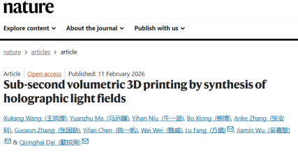 相关论文以《基于全息光场合成的亚秒级体积三维打印》(Sub-second Volumetric 3D Printing by Synthesis of Holographic Light Fields)为题发表在 Nature[1]。清华大学成像与智能技术实验室的戴琼海院士、吴嘉敏副教授和电子系方璐教授担任共同通讯作者,博士后王旭康、博士后马远瞩和博士生牛一涵是共同一作。