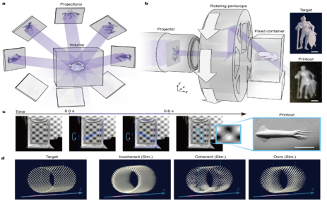 而清华的这项研究最大的创新在于,研究团队设计了高速旋转的潜望镜系统,直接在静止容器内投出高精度三维光场,不仅将总曝光时间缩短到了 1 秒以内,还避免了因容器运动引发的机械振动以及材料流动问题。