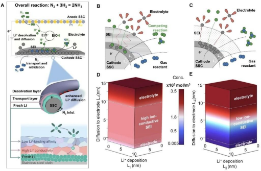 传统哈伯—博施法合成氨需高温高压且依赖化石能源,碳排放巨大。锂介导电化学还原制氨是绿色替代方案,但长期受限于电极表面固体电解质界面(SEI)离子传导差、高电流下易失效等问题,氨分电流密度长期停留在8mA cm⁻²以下,高压间歇电解能效也仅3%。