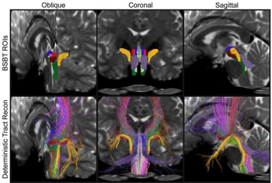 该研究图细节展示了脑干束区域。图中呈现了自动BSBT方法(上图)与真实标注法在三个不同脑切片中的对比结果。