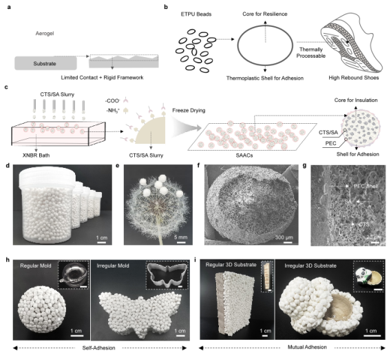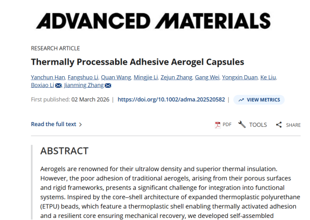 青岛科技大学张建明教授团队通过创新的核-壳复合结构和制备工艺,开发出一种具有自粘性的可热加工成型的气凝胶胶囊(SAACs),克服了传统气凝胶难以粘附和加工成型的缺陷,从而实现气凝胶材料的自粘接组装和异质表面附着,同时保持其轻质高隔热和阻燃等优良特性。相关研究成果发表在国际学术期刊《先进材料》上。