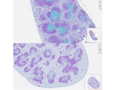 上图:未治疗小鼠脾脏中的蓝色染色B细胞。下图:用纳米颗粒处理小鼠脾脏中蓝色B细胞的减少。